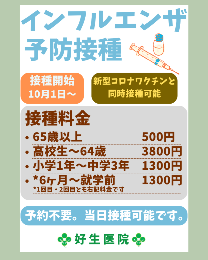 当院では10月1日より本年度のインフルエンザワクチン接種開始いたしました。